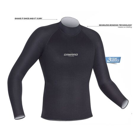 Αυτή η μακριμάνικη μπλούζα για θαλάσσια σπορ της Camaro, είναι πολύ λεπτή και ελαστική, στεγνώνει γρήγορα και προσφέρει εξαιρετική θερμομόνωση. Μπορεί να φορεθεί μόνη της ή σε συνδυασμό με πρόσθετα Wetsuits για να κρατήσει το σώμα περισσότερο ζεστό αν επιθυμείτε. Λόγω της ειδικής υδατοαπωθητικής επίστρωσης τιτανίου και της τεχνολογίας συγκόλλησης χωρίς ραφή, η μπλούζα στεγνώνει εξαιρετικά γρήγορα, είναι αντιανεμική και μειώνει τις οσμές. Η ειδική δομή του νεοπρενίου επιτρέπει τις κυψέλες εξωτερικά να παραμείνουν ανοιχτές, καθιστώντας το υλικό πολύ πιο εύκαμπτο από ένα συμβατικό neopren. Επίσης, η διαπέραση του νερού μειώνεται στο ελάχιστο και η απόδοση της θερμότητας αυξάνεται σημαντικά.