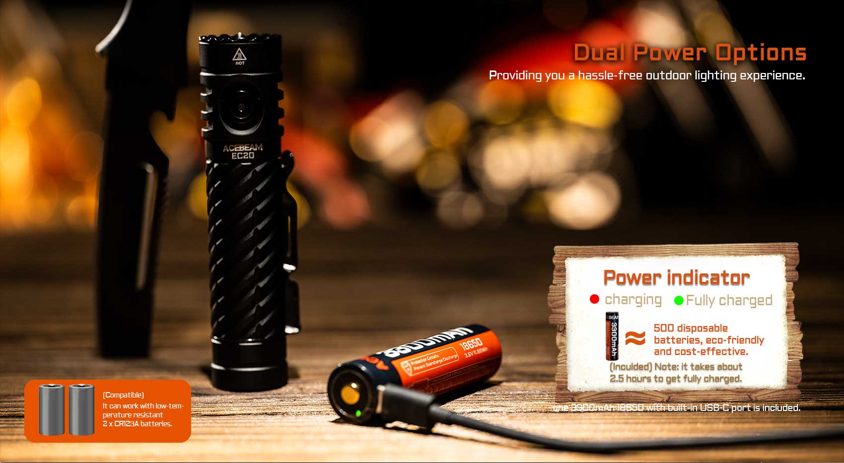 - Διπλή επιλογή τροφοδοσίας: μία μπαταρία 18650 ή δύο CR123A