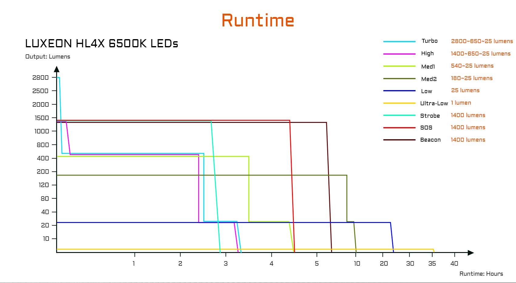 - SOS: 1300 lumens — 3025cd — 110 μέτρα — 4h30min