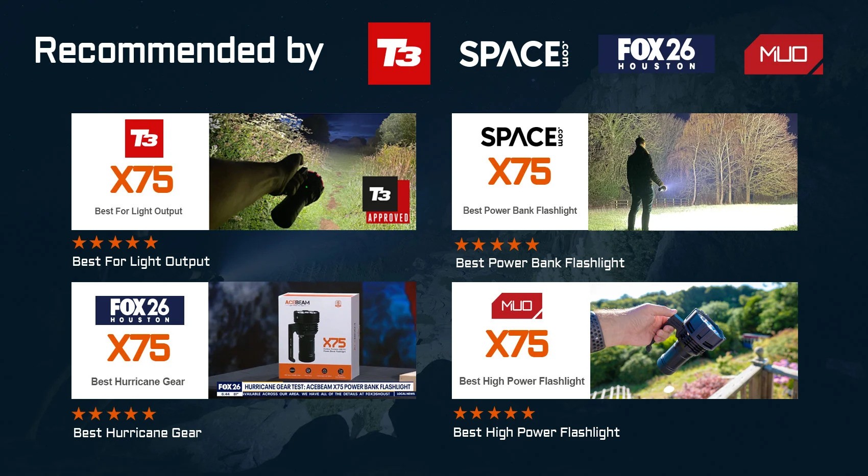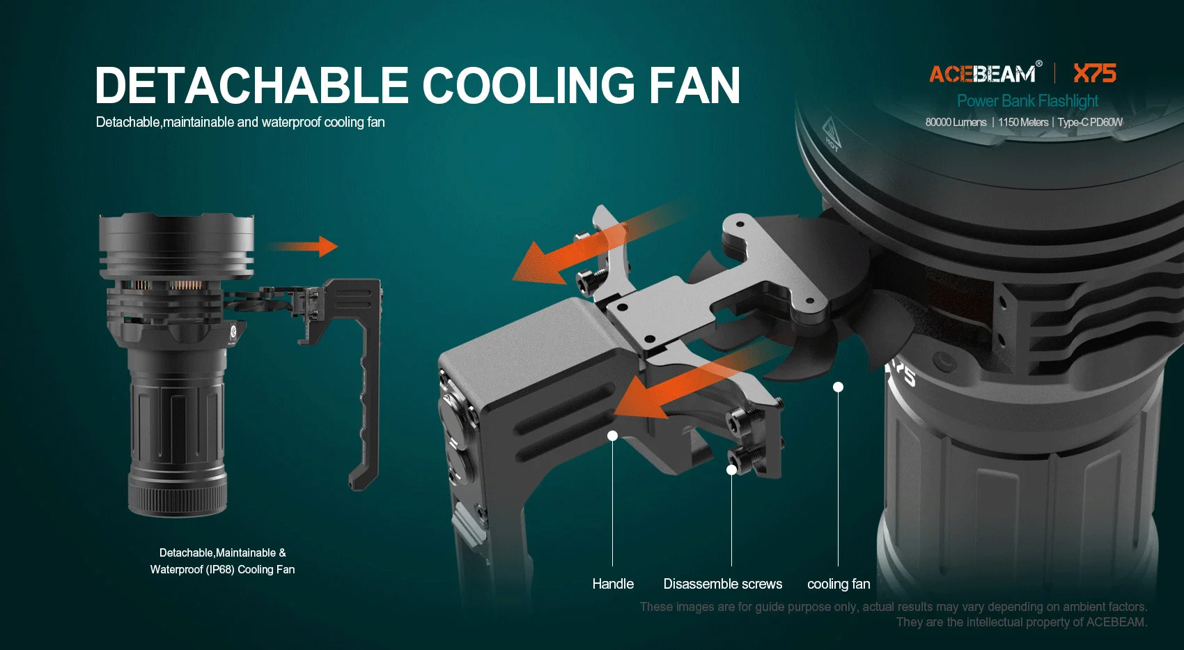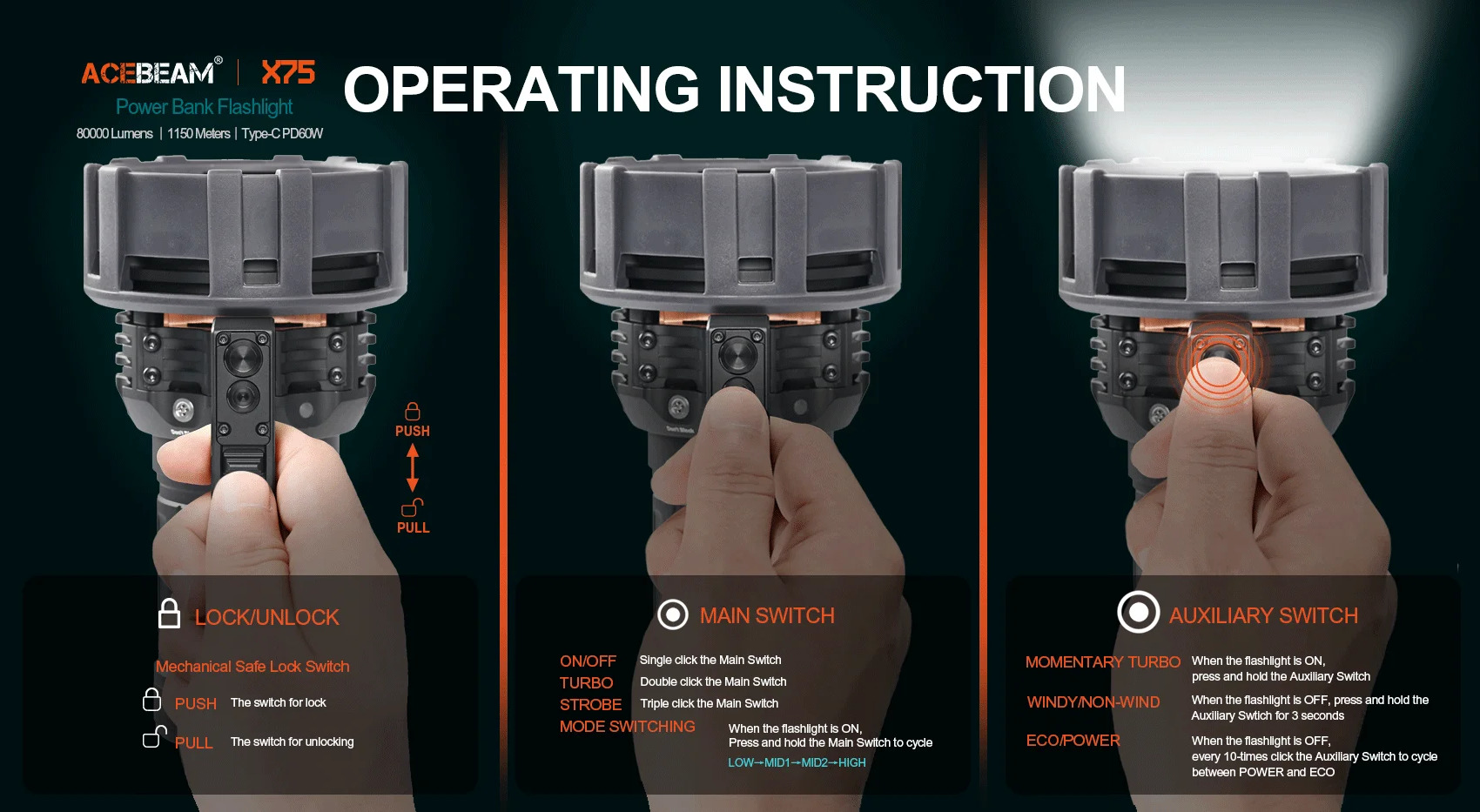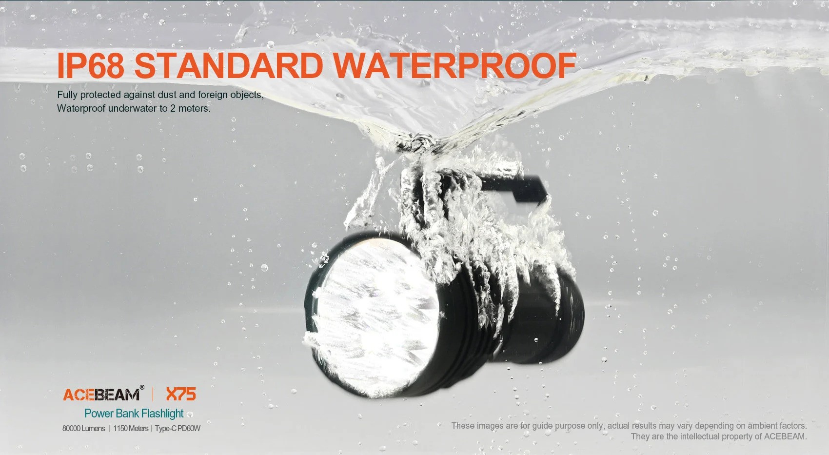 Ένας από τους πιο ισχυρούς φακούς στον κόσμο, ένα κορυφαίο προϊόν της Acebeam, ο φακός X75 Brightest Power Bank είναι το απόλυτο εργαλείο με το οποίο η ζωή σας θα γίνει πιο εύκολη. Με μέγιστη ισχύ 67.000 lumen, παρέχει συνεχή φωτισμό για 20 λεπτά στα 20.000 lumens, ενώ διαθέτει κύκλωμα σταθερής τάσης. Ο ανεμιστήρας (είναι αποσπώμενος και μπορεί να αντικατασταθεί) και ο μηχανισμός απαγωγής θερμότητας, καθιστά δυνατή την ψύξη του φακού και την παρατεταμένη χρήση του. Ο φακός υποστηρίζει τυπική φόρτιση PD60W και χρειάζεται 1,5 ώρα για να επαναφορτιστεί πλήρως, ενώ είναι συμβατός επίσης με την γρήγορη φόρτιση PD100W με την οποία χρειάζεται μόνο 1 ώρα για να επαναφορτιστεί πλήρως. Είναι αδιάβροχος και ανθεκτικός στη σκόνη με βαθμολογία IP68, επιτυγχάνοντας τα υψηλότερα επίπεδο προστασίας. Με ενσωματωμένη μπαταρία 4 X 21700, διαθέτει power bank που μπορεί να χρησιμοποιηθεί και ως πηγή φωτός. Αν και θεωρείται γίγαντας στους φακούς, ο X75 Brightest Power Bank διαθέτει το κατάλληλο μέγεθος για λειτουργία με το ένα χέρι. Αυτός ο φακός σας προσφέρει μια ευχάριστη εμπειρία χρήσης, κάτι που θα σας κάνει να ανυπομονείτε να τον χρησιμοποιήσετε ξανά όταν προκύψει μια έκτακτη ανάγκη.