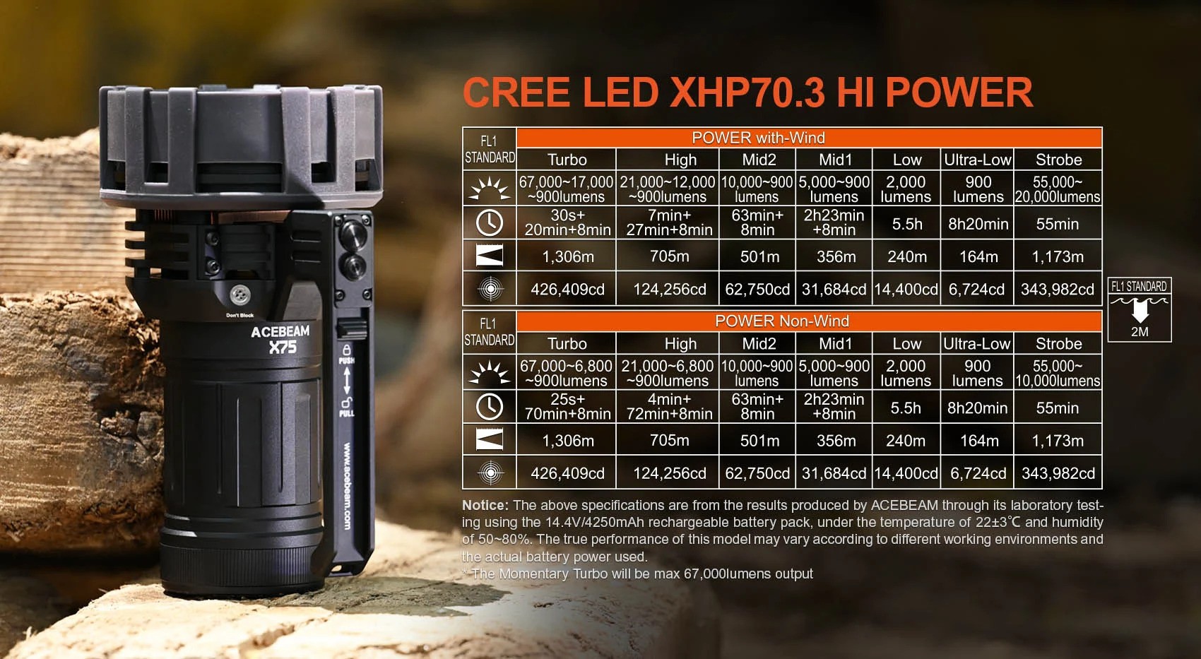 - Turbo: 67.000 ~ 6.800 ~ 900 lumens/ 124.256 κεριά/ 1.306 μέτρα/ 20 δευτερόλεπτα + 82 λεπτά + 8 λεπτά