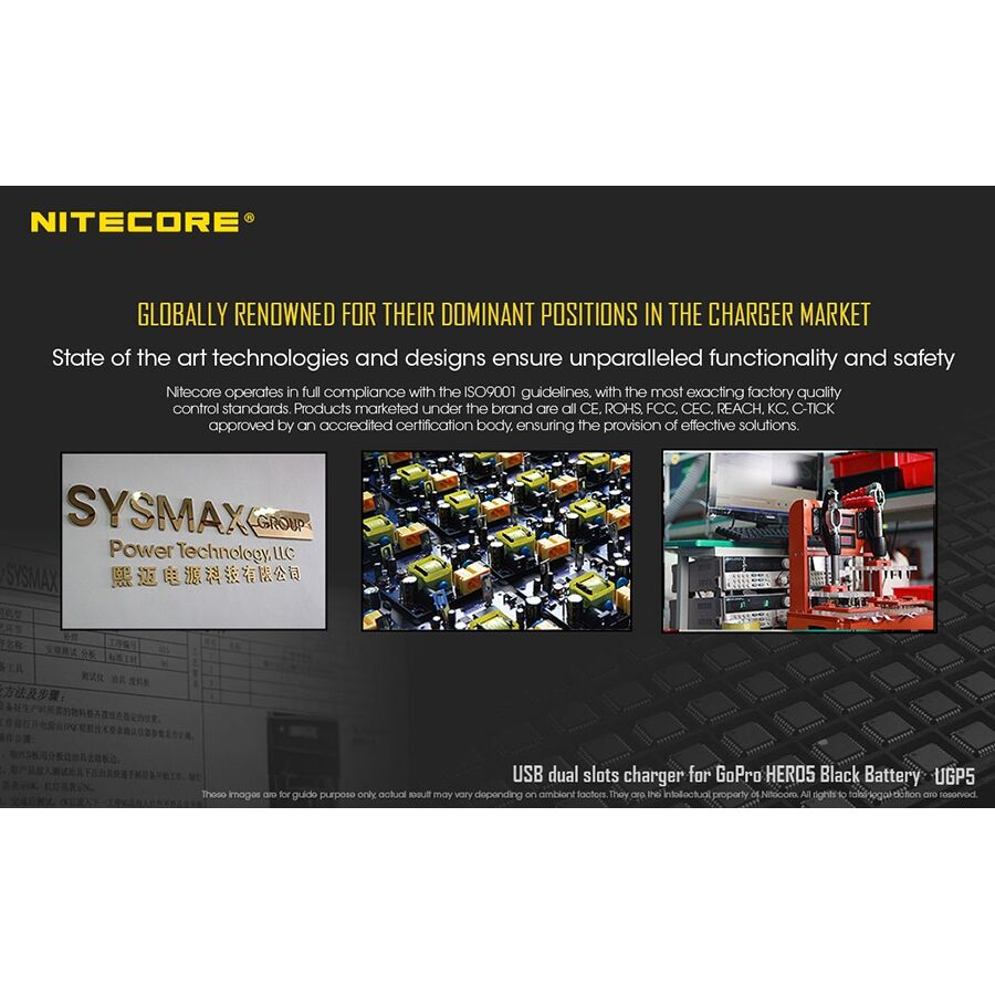 ΦΟΡΤΙΣΤΗΣ NITECORE UGP5 Ένας φορτιστής USB με δύο θέσεις φόρτισης σχεδιασμένος αποκλειστικά για τις μπαταρίες GoPro Hero5 Black. Μπορεί να φορτίσει δύο μπαταρίες GoPro Hero5 Black ταυτόχρονα. Η οθόνη υγρών κρυστάλλων (LCD) του φορτιστή παρέχει πληροφορίες σε πραγματικό χρόνο και την γενική κατάσταση της φόρτισης. Το μγέγιστο ρεύμα φόρτισης σε μία θέση είναι 750mAh. Η NITECORE είναι παγκοσμίως γνωστή για την κατασκευή φορτιστών απαράμιλλης ελιτουρηκότητας και ασφάλειας. Η NITECORE συμορφώνεται πλήρως με το πρότυπο κατασκευής ISO9001. Το προϊόν φέριε όλες τις πιστωποιήσεις CE, RoHS, FCC, CEC, REACH, KC, C-TICK εξασφαλίζοντας την παροχή μιάς αποτελεσματικής λύσης. Είναι συμβατός με μία μεγάλη ποικιλία φορητών παροχών ενέργειας, USB ανταπτορ, Ηλιακά πάνελ, Power Bank, τους φορτιστής F1 & F2 της NITECORE που λειτουργούν και ώς Power Bank. Χρειάζεται μόλις 1,5 ώρες για την πλήρη φόρτιση μίας μπαταρίας. Το έξυπνο σύστημα φόρτισης επιλέγει αυτόματα το σωστό ρεύμα φόρτισης σύμφωνα με την μπαταρία που έχει εισαχθεί. Η φόρτιση σταματά αυτόματα αν εντοπιστεί οποιοδήποτε σφάλμα στην μπαταρία. Τα υλικά κατασκευής του είναι ανθεκτικά στην φωτιά και επιβραδυντικά της φλόγας. Το μέγεθος του είναι μικρό και στο πίσω μέρος του διαθέτει ειδικές εγκοπές/θήκες για την κάλυψη του καλωδίου USB. Είναι ασφαλισμένος σε παγκόσμιο επίπεδο από ασφαλιστική εταιρία. Τεχνικά χαρακτηριστικά Είσοδος:                 DC5V >500mA Έξοδος:                  4,35V ±1% 750mA x 2 MAX Συμβατός με:         Μπαταρίες GoPro Hero5 Black Πηγή εισόδου:       USB Διαστάσεις:             97mm x 50mm x 26.5mm Βάρος:                    67,5 γραμμάρια