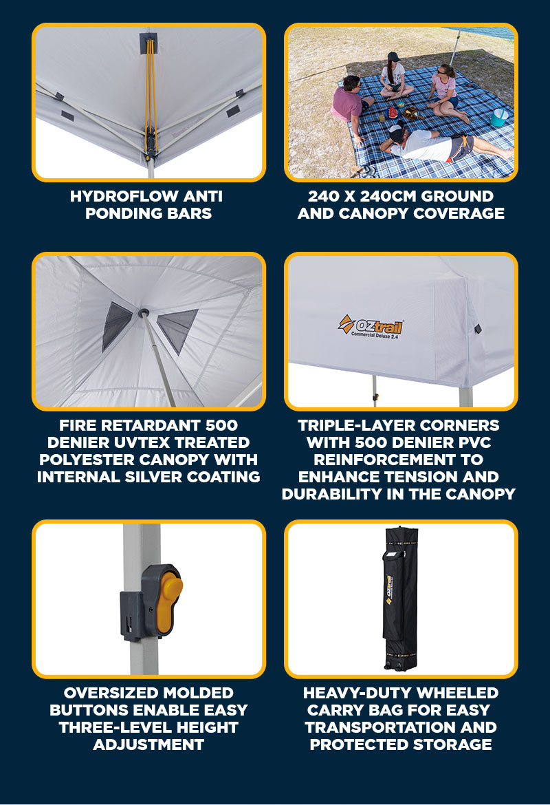 Το πιο ανθεκτικό κιόσκι της Oztrail ανανεώθηκε πρόσφατα! Οι ράβδοι Hydro Flow Anti Ponding εξασφαλίζουν ότι δεν θα λιμνάζει νερό σε ολόκληρο το κιόσκι. Τα κιόσκια Commercial είναι ιδανική για συχνή χρήση και για επαγγελματίες.