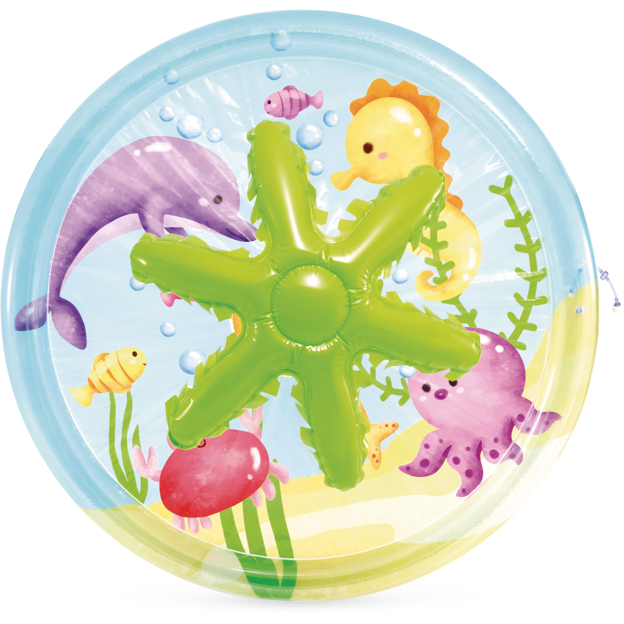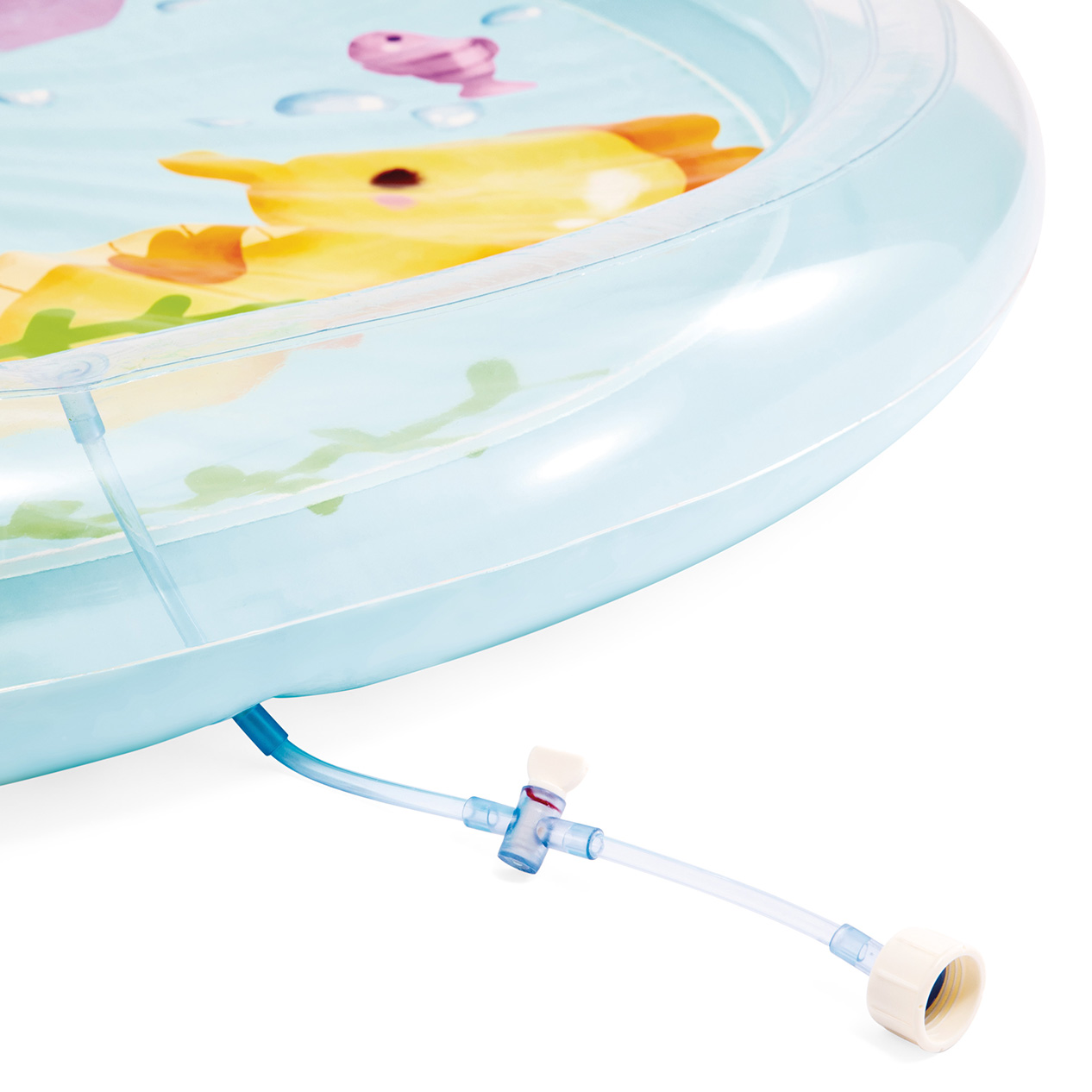 Φουσκωτή παιδική πισίνα με έναν φοίνικα στη μέση, μετατρέπεται σε ένα ευχάριστο σιντριβάνι όταν συνδέεται με το λάστιχο του κήπου χάρη στις τρύπες περιμετρικά. Για παιδιά από 2 ετών.