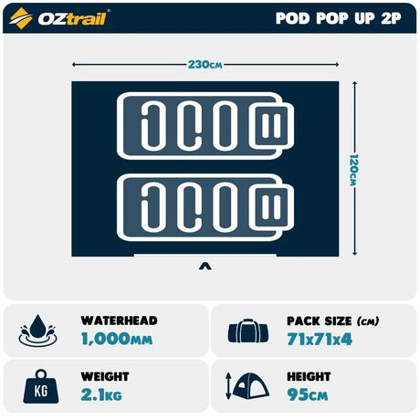 Για όσους προτιμούν μια ποιοτική αλλά εύκολη στη χρήση και προσιτή οικονομικά σκηνή 2 ατόμων η Oztrail παρουσιάζει την Pop Up Pod Tent 2P. H σκηνή της Oztrail ξεχωρίζει για την αποσπώμενη οροφή, την διάτρητη κατασκευή σε επιλεγμένα σημεία του υλικού και άνετο χώρο για δύο άτομα ενώ διαθέτει άπλετο χώρο και για την εναπόθεση των αποσκευών. Αποτελεί την ιδανική λύση για μικρές αποδράσεις όπου θέλουμε λιγότερες αποσκευές και εύκολη τοποθέτηση.