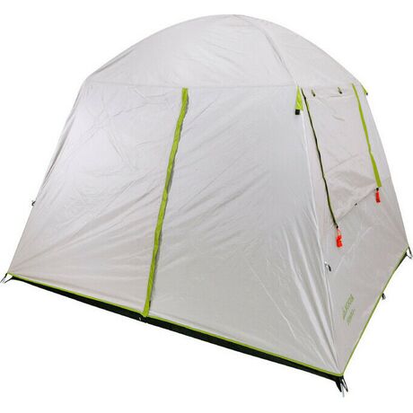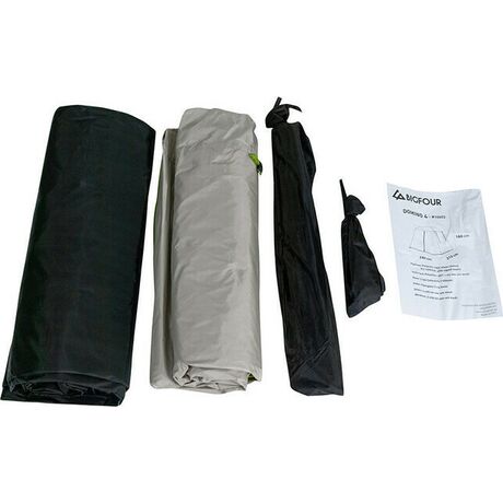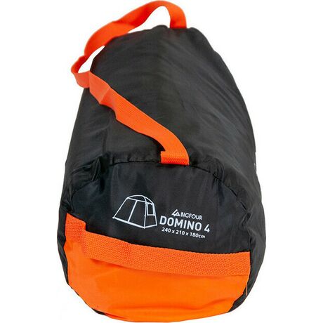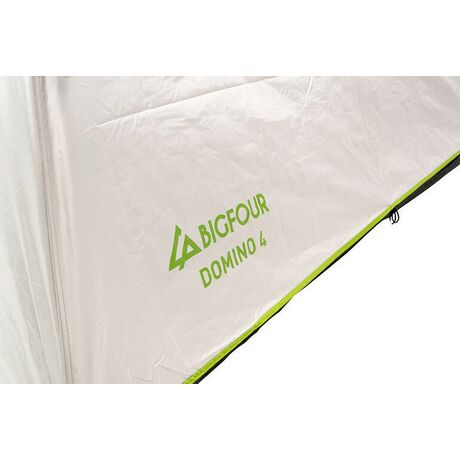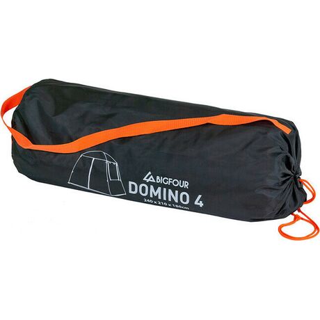 Σκηνή κάμπινγκ Bigfour Domino 4 με 2 πόρτες, κουνουπιέρα και 2 πλαϊνά παράθυρα για καλύτερο εξαερισμό. Το εξωτερικό υλικό της είναι από πολυεστέρα 190T με αδιαβροχοποίηση 1500 χιλ. και προστασία UV+30 από την ηλιακή ακτινοβολία. Οι μπανέλες είναι κατασκευασμένες από fiberglass και έχουν διάσταση 2 x 8.5 χιλ. και το πάτωμα PE θα σας προσφέρει την μέγιστη προστασία από την υγρασία. Το μαύρο εσωτερικό ύφασμα, αλλά και η επίστρωση του εξωτερικού υφάσματος, αφήνουν λιγότερο φως να περάσει στο εσωτερικό, για περισσότερη ώρα ύπνου το πρωί.
